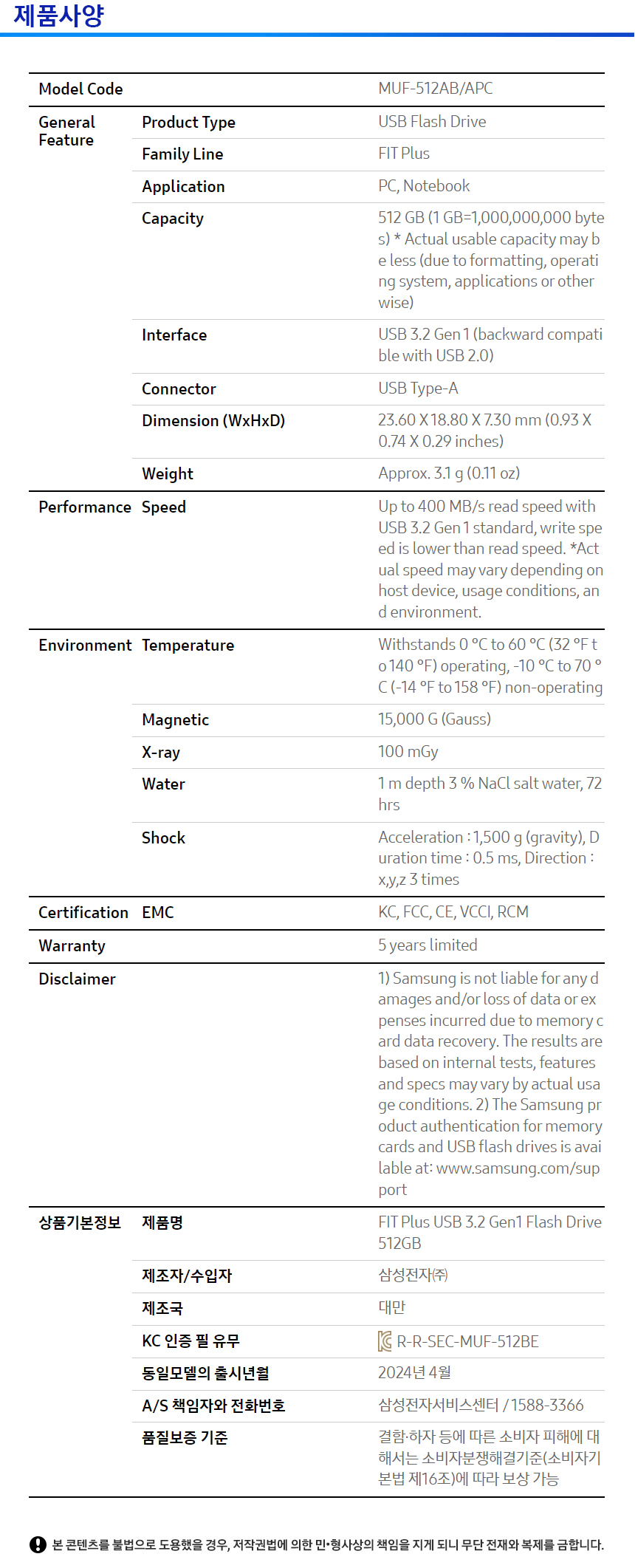 ■ 품명 및 모델명 : 삼성 FIT USB(MUF-512AB/512GB/삼성)