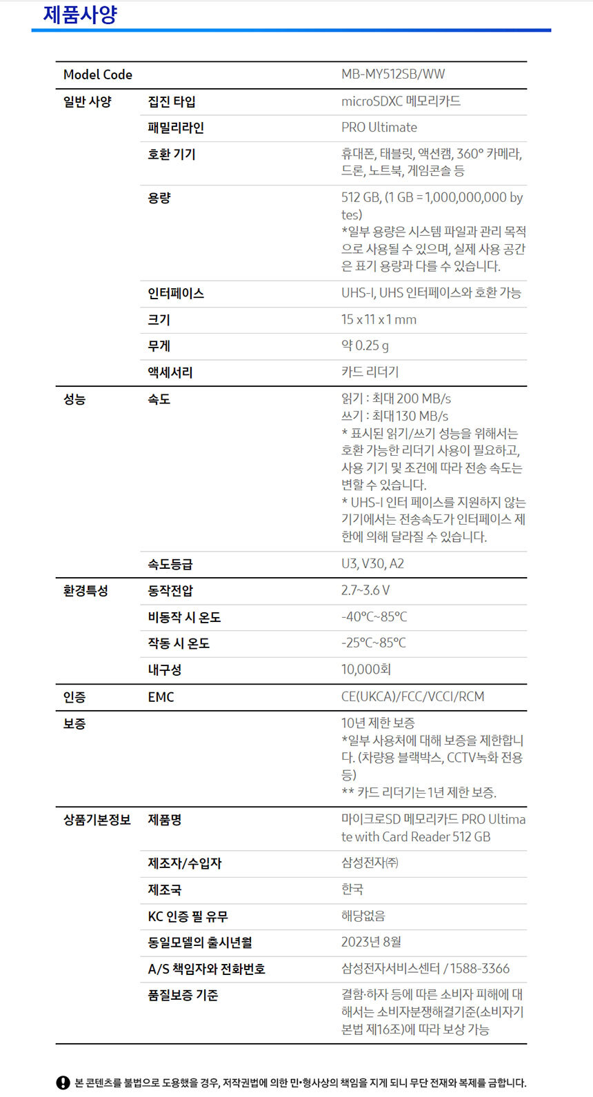 ■ 품명 및 모델명 : MicroSD Pro Ultimate(MB-MY512SB/WW/512GB/삼성)리더기구성