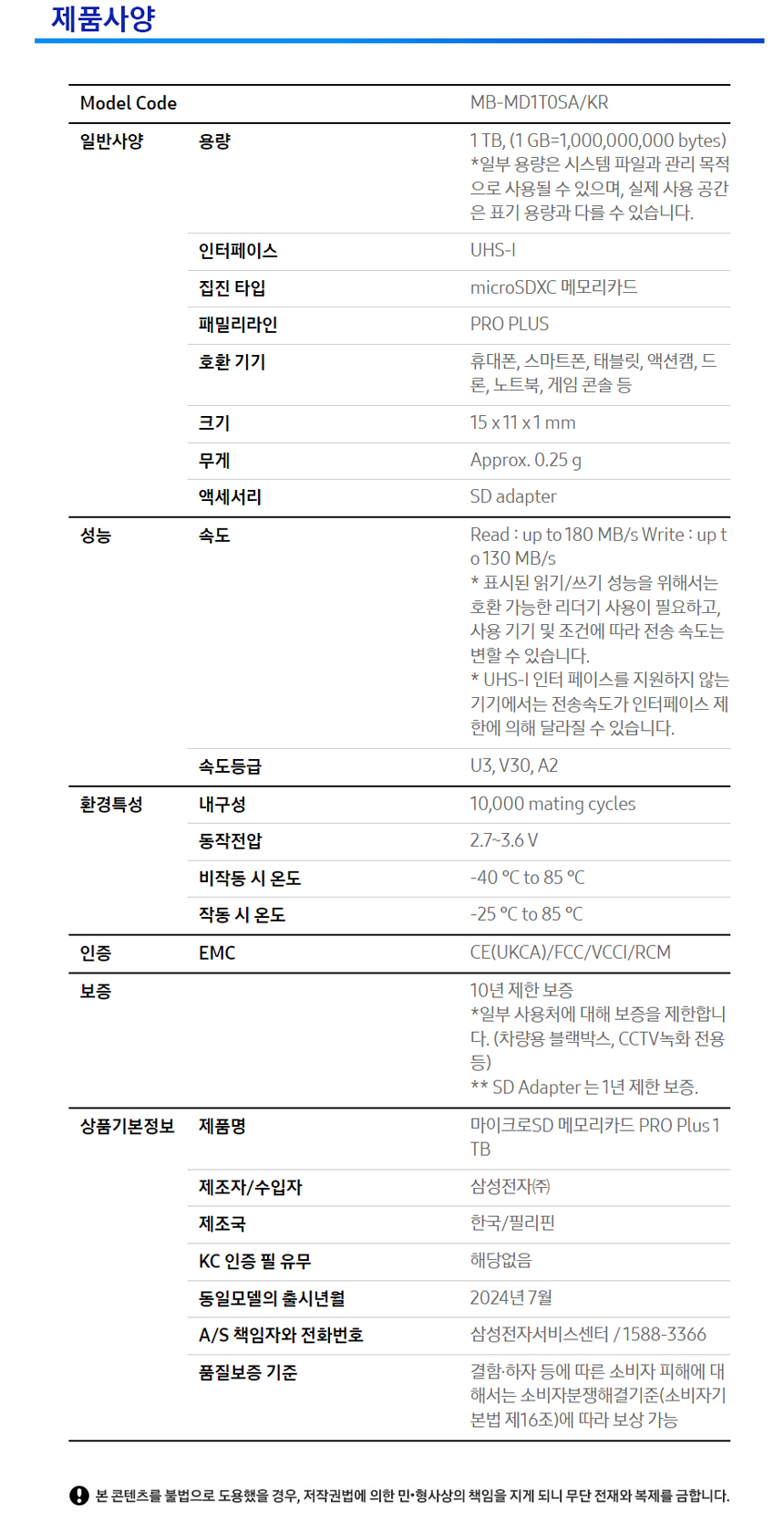 ■ 품명 및 모델명 : Micro SD 메모리카드 PRO PLUS(MB-MD1T0SA/KR/1TB/삼성)