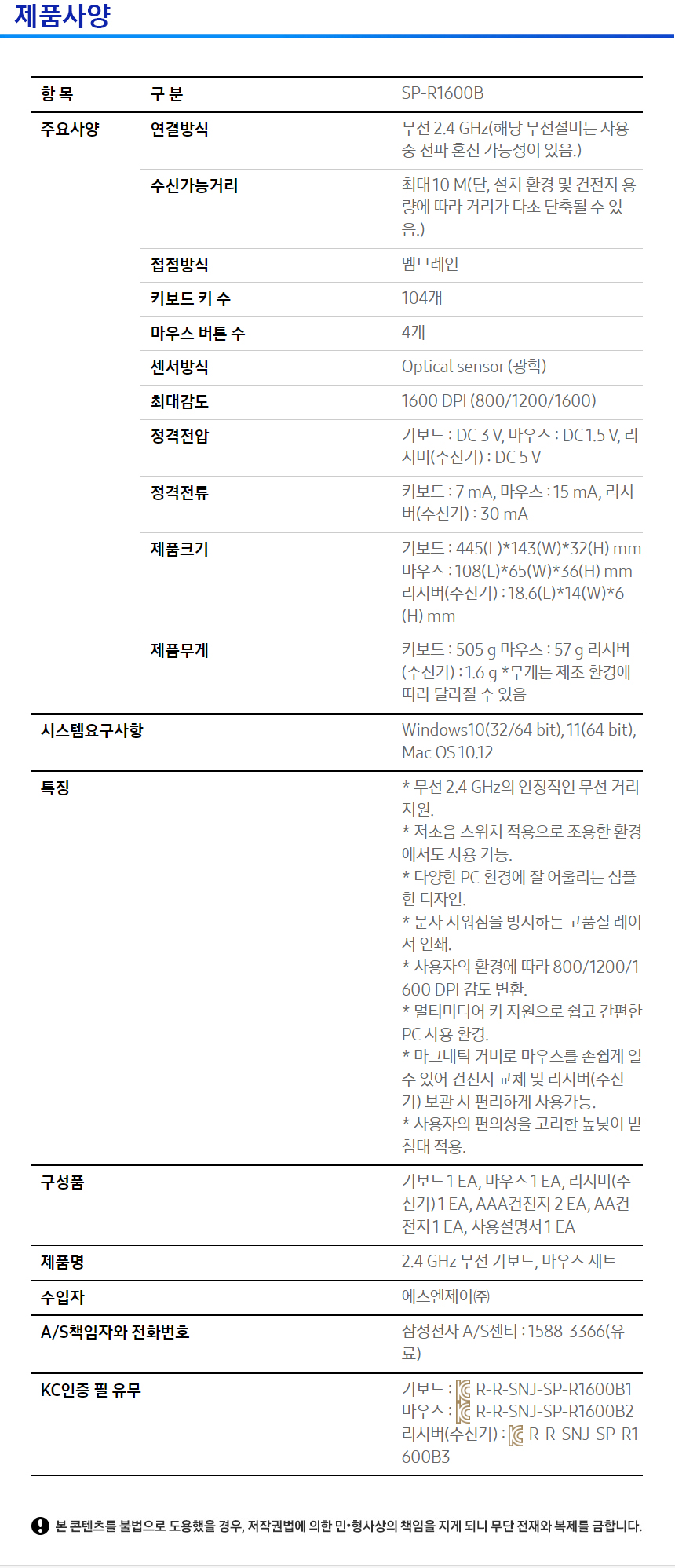 ■ 품명 및 모델명 : 무선콤보세트(SP-R1600B/삼성)