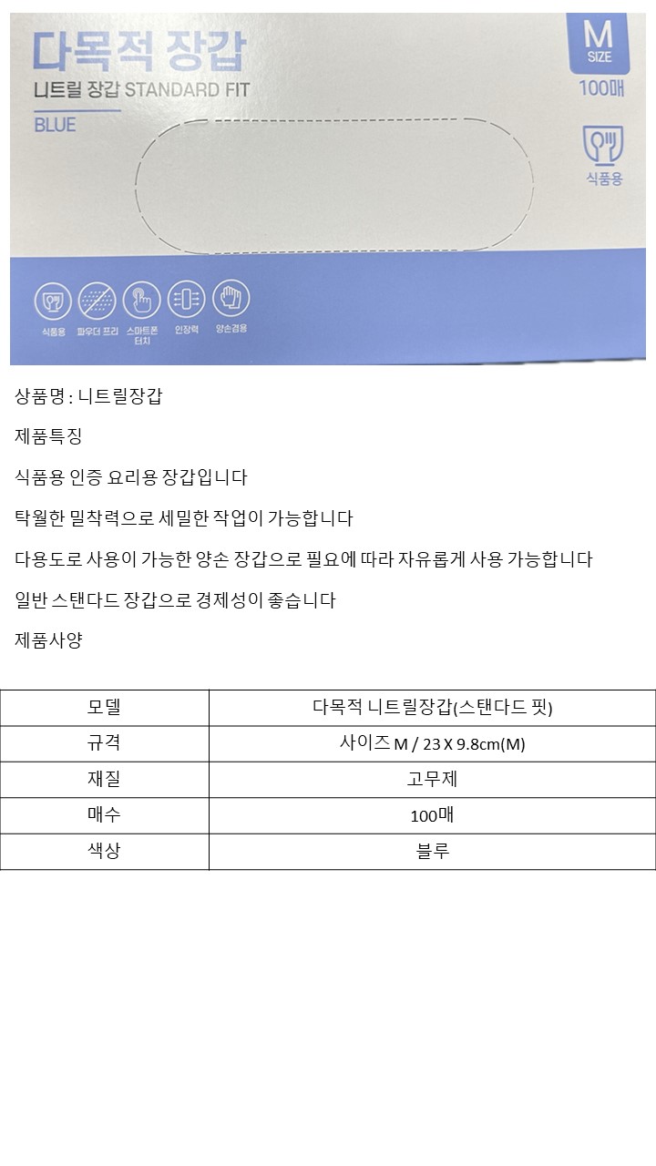 ■ 품명 및 모델명 : 니트릴장갑(다목적니트릴장갑/스탠다드핏/블루/3.5g/100매/사라야차이나)