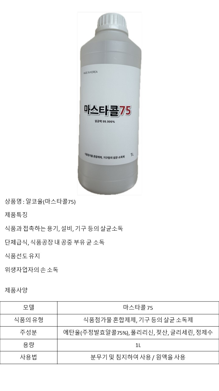 ■ 품명 및 모델명 : 알코올(마스타콜75/75%/1L/성운디엘에스)