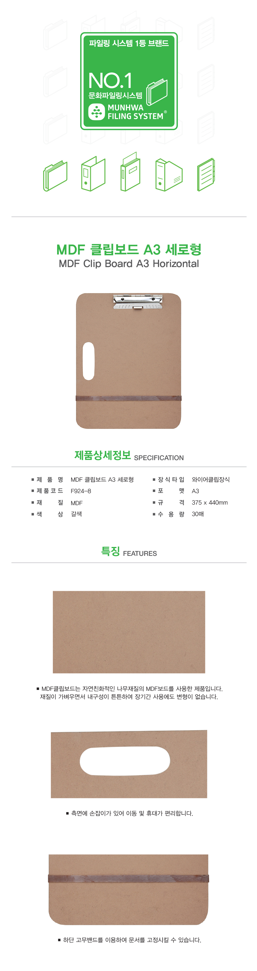 ■ 품명 및 모델명 : MDF 손잡이형 클립보드(A3/F924-81/문화산업)