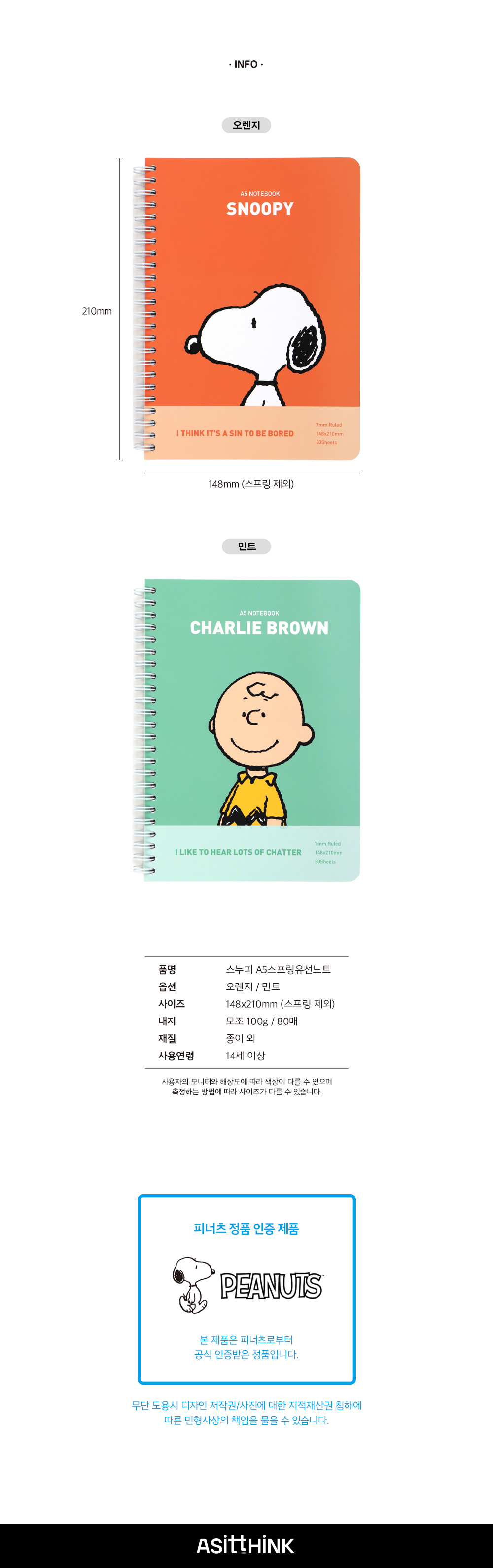 ■ 품명 및 모델명 : 피너츠 A5스프링유선노트(오렌지/에이치엠플러스)