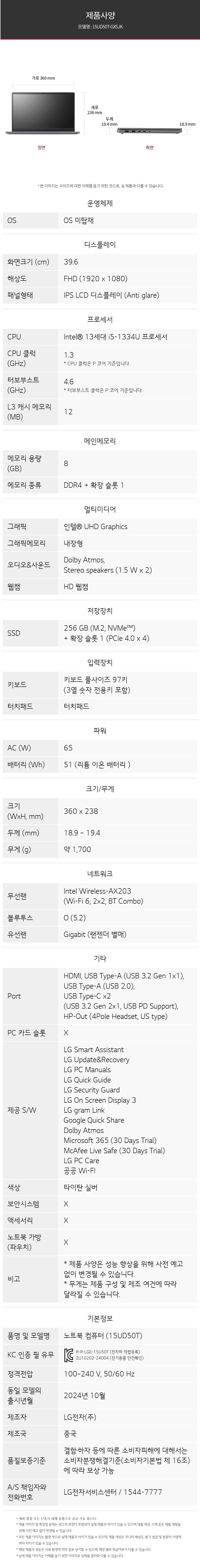 ■ 품명 및 모델명 : [업체별도배송]울트라 PC 노트북(15UD50T-GX5JK/15.6"/FreeDos/LG)