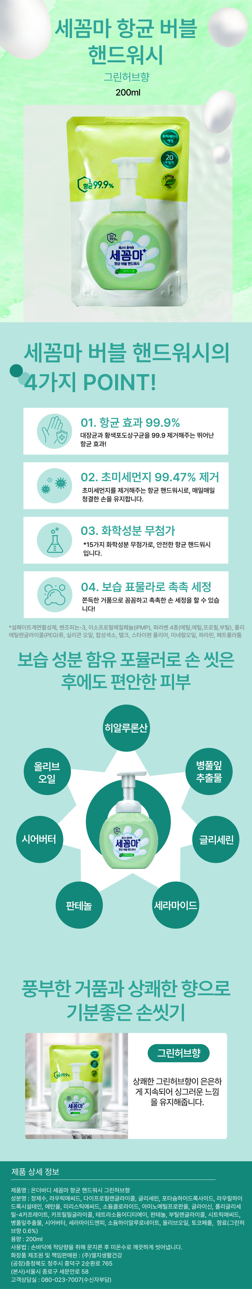■ 품명 및 모델명 : 세꼼마 버블항균 핸드워시 200ml 리필 그린허브(LG생활건강)