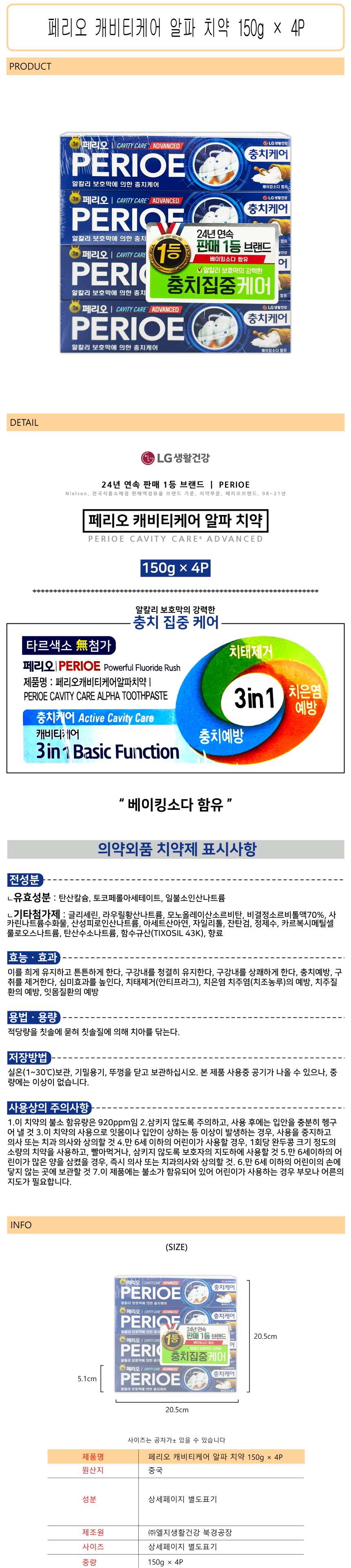 ■ 품명 및 모델명 : 페리오 캐비티케어 치약 150g 4입(140*180*45mm)