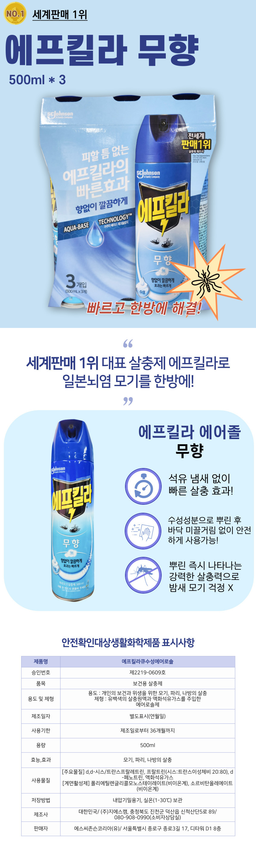 ■ 품명 및 모델명 : 존슨 에프킬라 에어졸 무향 (500ml*3입)