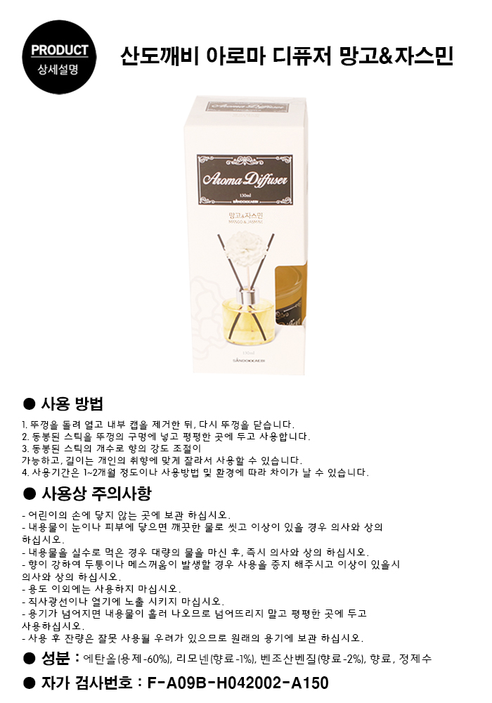 ■ 품명 및 모델명 : 산도깨비 아로마디퓨저 망고&자스민 130ml