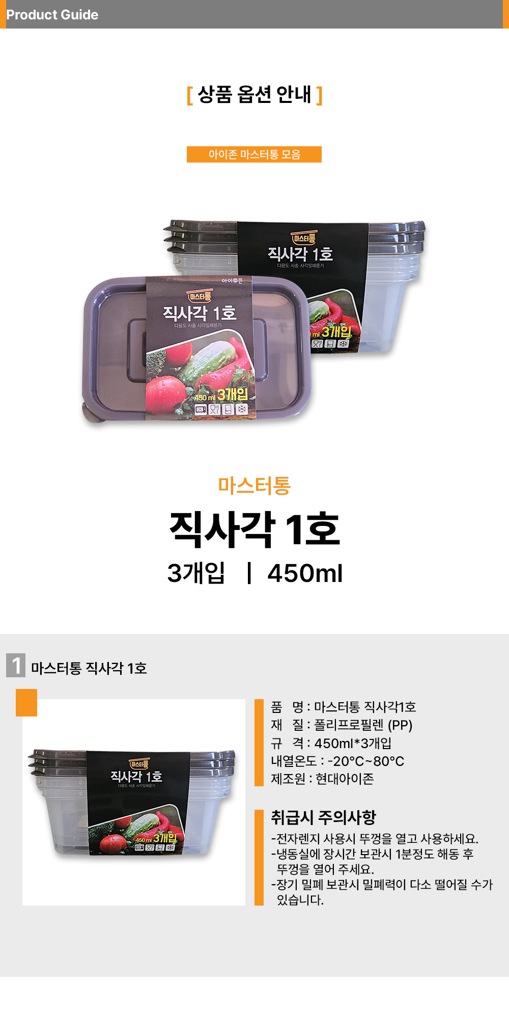 ■ 품명 및 모델명 : 밀폐용기 직사각1호 3p(450ml/15*9*5.5cm)