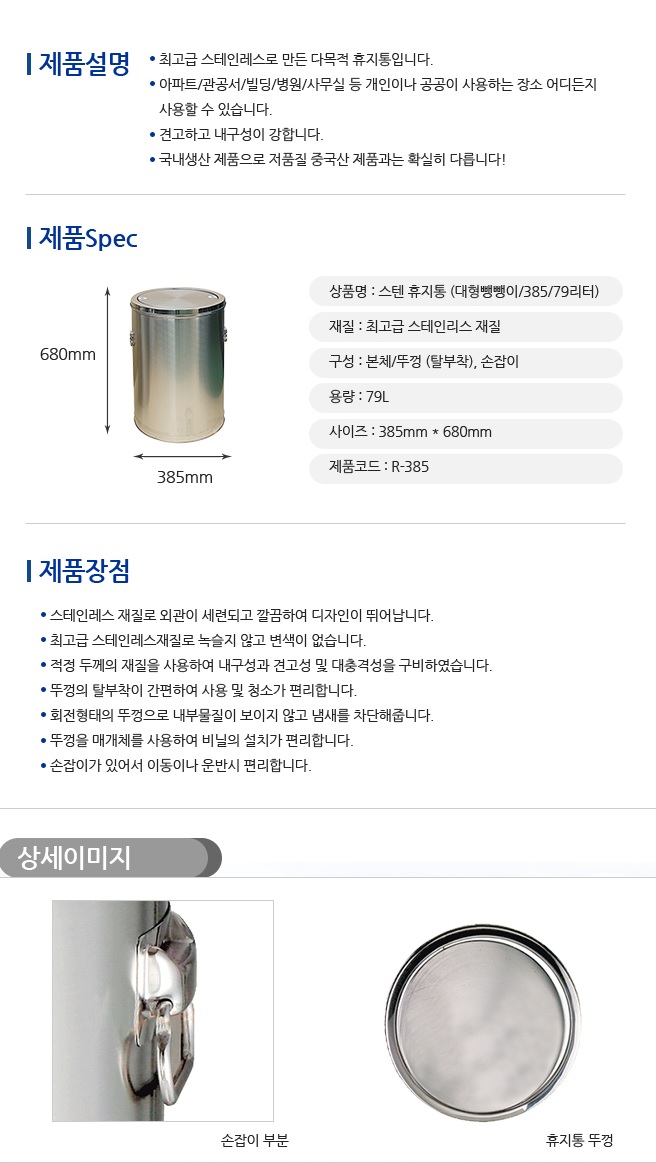 ■ 품명 및 모델명 : [업체배송]뱅뱅이 휴지통 스텐 R300 79L 385x680mm