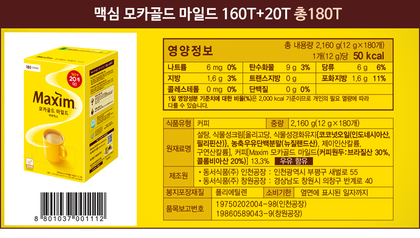 맥심 모카골드 커피믹스(12g/160+20T/동서식품)/개